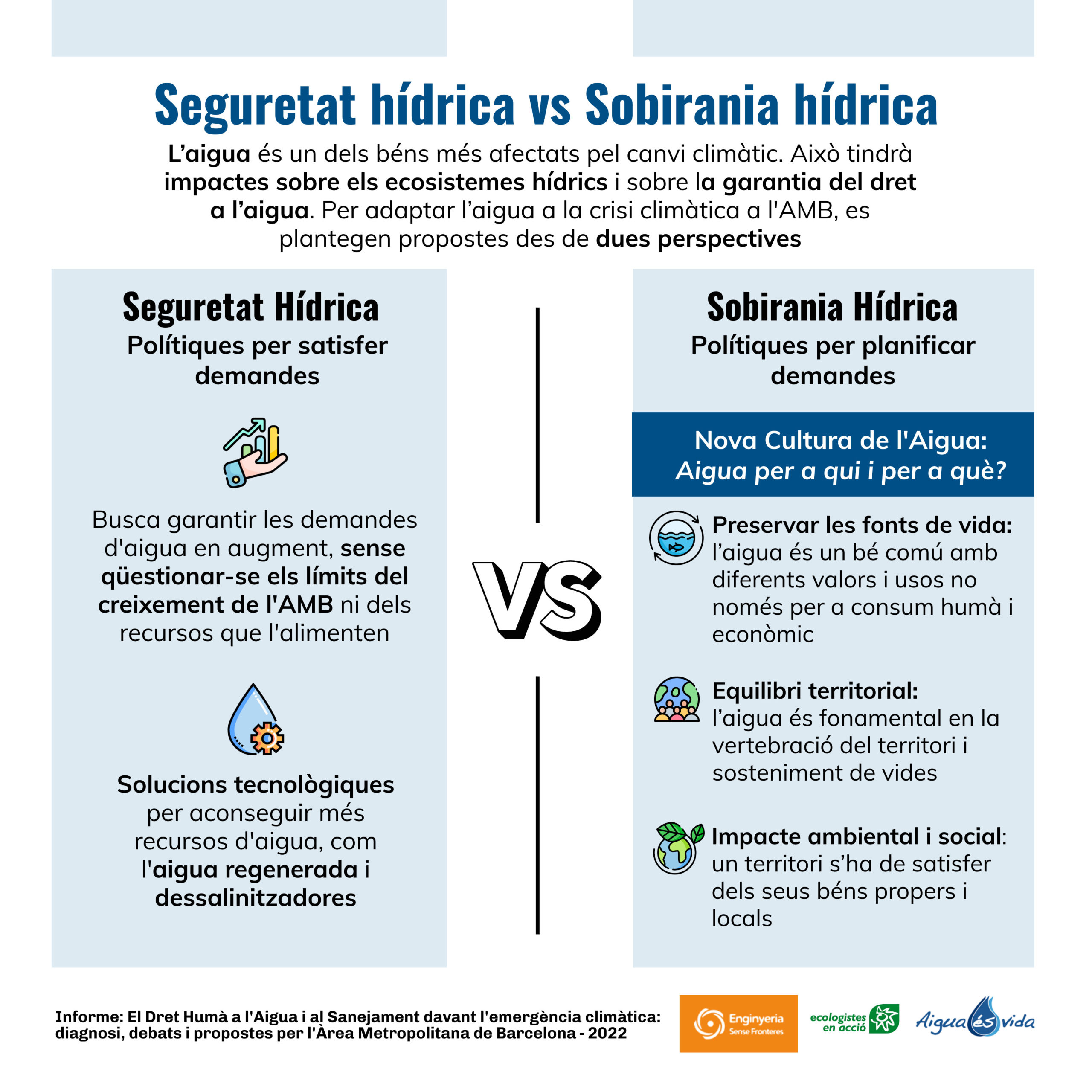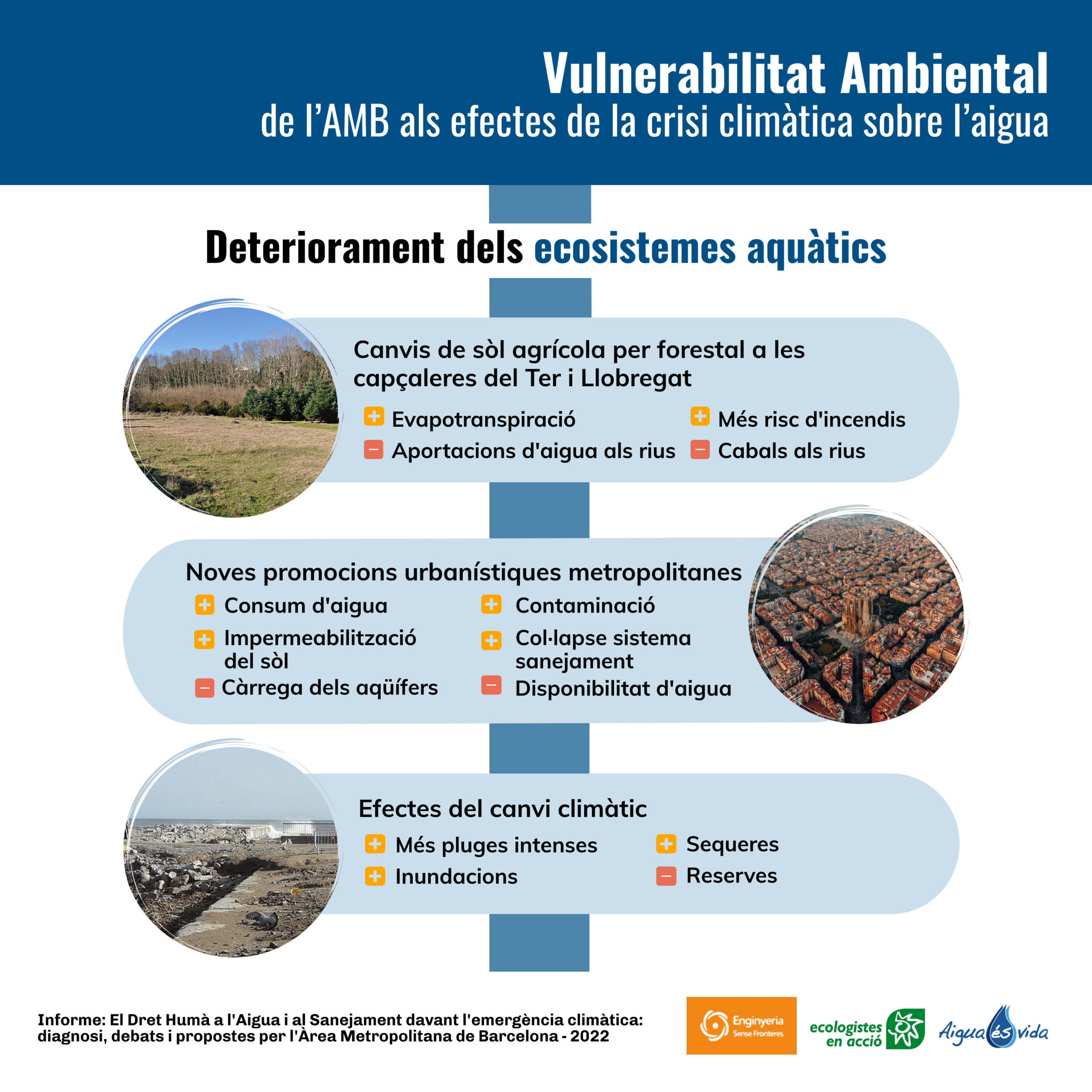En 2021, Enginyeria Sense Fronteres (ESF) y Ecologistes en Acció de Catalunya, con el apoyo de Aigua és Vida, contaron con nuestros servicios para realizar un estudio sobre los impactos del cambio climático en la garantía del Derecho Humano al Agua y al Saneamiento en el Área Metropolitana de Barcelona.